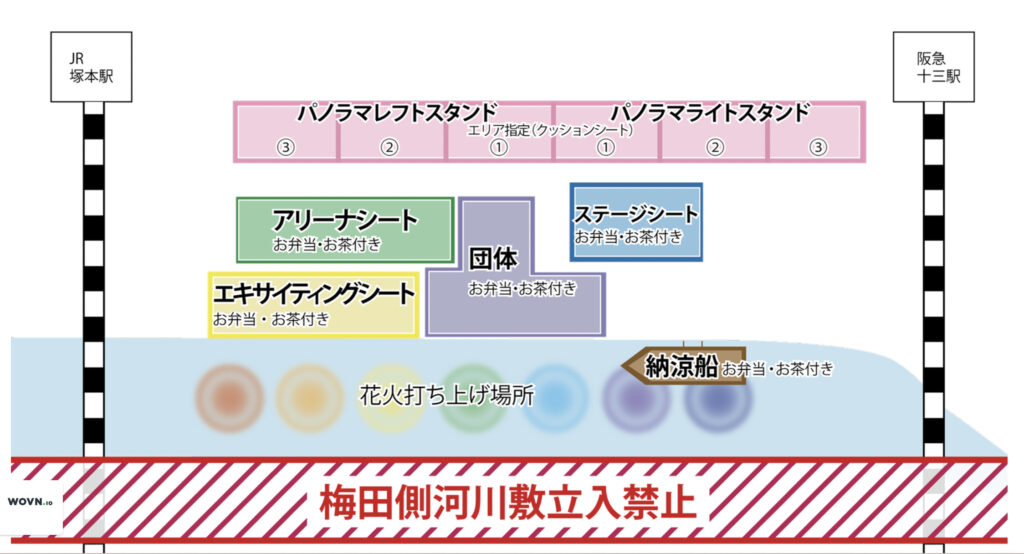 | 右岸 十三会場 | エキサイティングシート | 大人 11,000円 子供 5,500円 | 大人 当日販売なし 子供 当日販売なし | エリア指定自由席 |