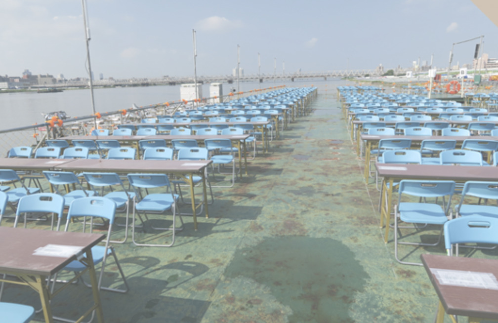 船ではありません。河岸に張り出した川岸から大型台船を着岸させた最も近くで花火を見ることができるシートです。