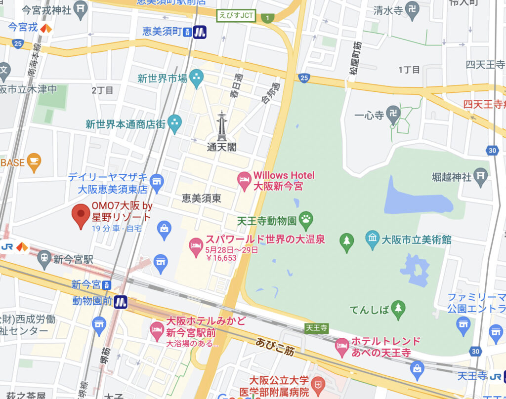 この地図でご覧になってお分かりのように1番近い最寄りの駅は新今宮になります。JR新今宮ですね。または南海の新今宮も同じ駅で乗り合わせています。そして地下鉄御堂筋線四ツ橋線の動物園前も最寄りの駅になります。ここだけ直行で行きたい方はこちらの駅がベスト。